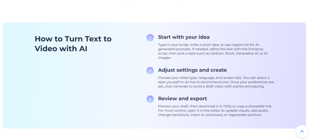 Fast templates and automation: Renderforest offers hundreds of templates for different types of videos (promotional videos, intros, presentations, social networks). AI helps customize templates for text, shot selection, and music, which will speed up the entire creation process. – Simple interface: The editor is clear and accessible even for beginners. Drag-and-drop, clear editing steps, and previews of the result reduce the learning curve. – Voice generation and subtitling: Built-in speech synthesis tools and automatic subtitles work reliably for everyday use and will make working with videos for social networks easier. – Extensive media library: Contains stock videos, animations, music, and icons, which greatly facilitates the assembly of a project without the need for external resources. – Output flexibility: Export to various formats and resolutions, support for social networks and professional presentations.